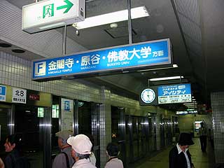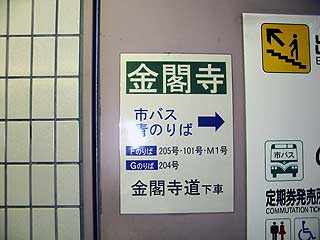 ●改札口を抜けたら、「バスターミナル」にむかって、案内板の矢印に従って進みます。 途中、写真のような「金閣寺」の案内表示板があります。矢印に従って進み、エスカレータを上ると、おのずとバス乗り場に到着します。 |