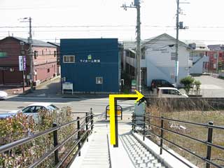 ●まっすぐ坂をおりると、途中で階段があります。 階段を下りてちょっと大き目の道路に出たら、右に曲がります。 (地図で言うとこの辺) |