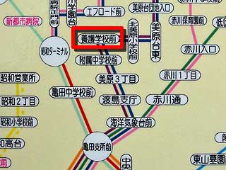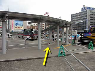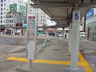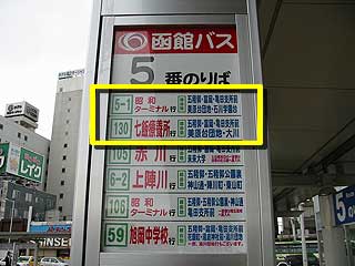●5番乗り場に到着です。 ここからバスに乗って「養護学校前」に行きます。途中、五稜郭、亀田支所、渡島支庁を通過します。 バス賃は片道250円です。 右手に案内所がありますので、どのバスに乗ればよいのかわからず不安なときは、係員に聞くとよいでしょう。 「渡島支庁の方に行きたい」と言えば、すんなり答えが出てくると思います。 また、 バス・路面電車共通カード(プリペイドカード)も売られています。 |