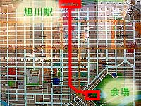 次は下見 前売り券を買って帰るだけではつまらないので、会場の下見もしました。 旭川駅の案内地図で調べると、赤い線の経路をだまって歩いていけば、会場に到着することができます。 私の足で歩いて20分ぐらいで到着しました。 (→会場までの道のり) |