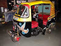 すると、通路の真中にある黄色と黒の物体がありました。 おぉ。これは本物のオートリクシャーではありませんか。日本で実物を見られるなんて感動ものです。 後ろにはサイクルリクシャ−(自転車式の人力車)があり、そのわきにはアルナーチャラムでおなじみのパーン売りのスタンドもあります。 |