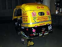 バーシャといえばオートリクシャー。ということで感動してばかりはいられません。早速デジカメで撮影です。 映画では全体まっ黄色のリクシャーでしたが、このリクシャーは下半分が黒です。地域によってカラーリングが違うようです。 バーシャでは、ボンベイのシーンでこの配色のリクシャーを見かけますし、ミーナ嬢主演のタミル映画「RHYTHM」でもボンベイのシーンでこの配色のリクシャ−を確認できます。 |