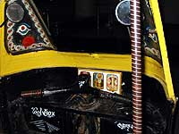 でも、考えてみればオートバイを3輪にして屋根をつけたものだから、こんな感じなのかな。と納得しました。 運転席はもろバイクのハンドルです。 社内には、神様のステッカーなんかも貼られております。 バーシャの劇中の台詞でもあったように、リクシャ−って本当に強度が弱そうですね。 |